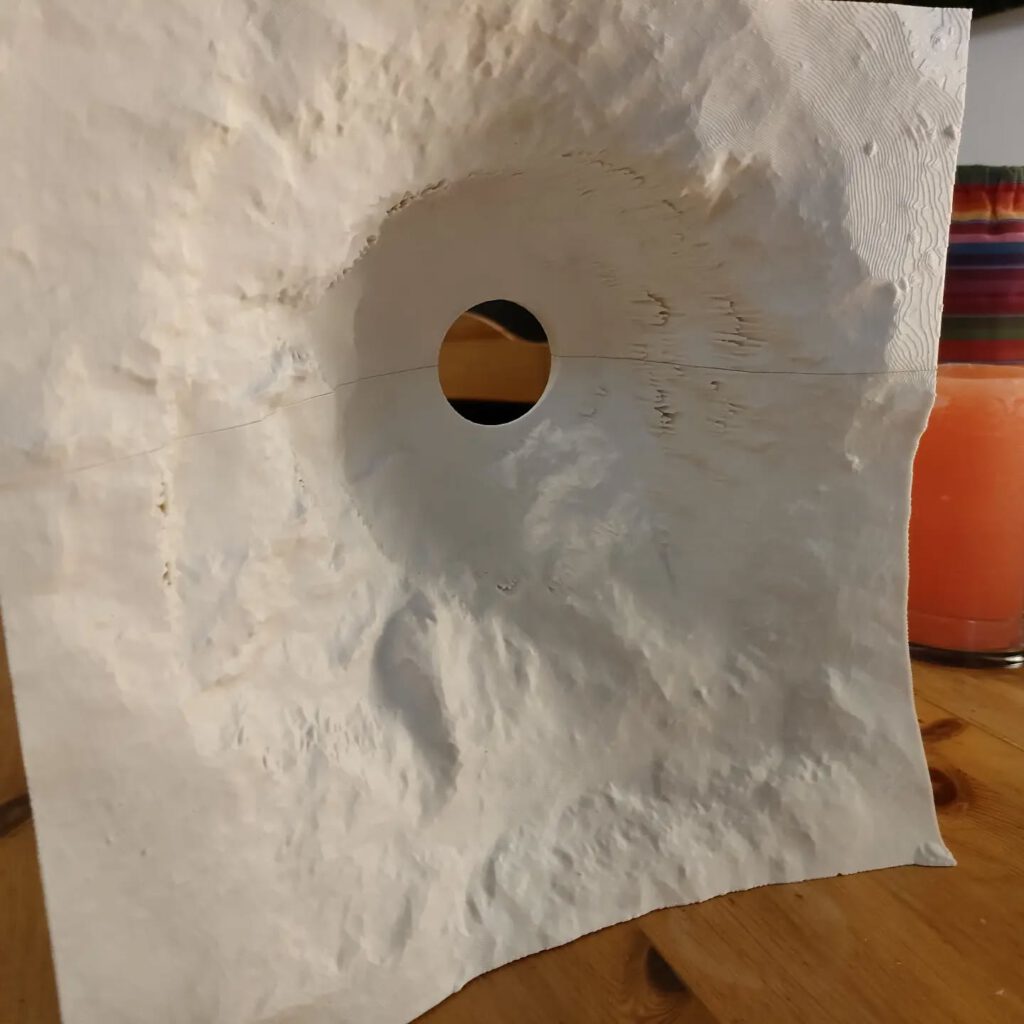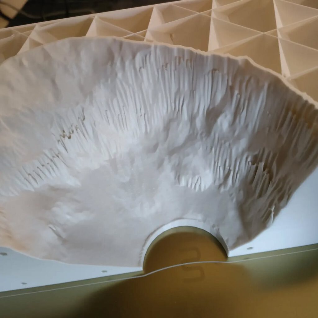IIm Winter 2024 kam Ai Lun vom GFZ Potsdam auf uns zu und fragte, ob wir ihr helfen könnten, eine sehr spezielle Form zu drucken. Sie arbeitete an einer Untersuchung zum Vulkan Lascar in Chile, wo sich nach einem Ausbruch der Kraterboden erst angehoben und später zu einem tiefen, runden Trichter abgesenkt hatte. Auf Satellitenaufnahmen war das gut zu erkennen, aber um zu verstehen, warum der Krater so reagiert hatte, brauchte ihr Team ein echtes Modell der Kraterform für genaue Laborexperimente.
