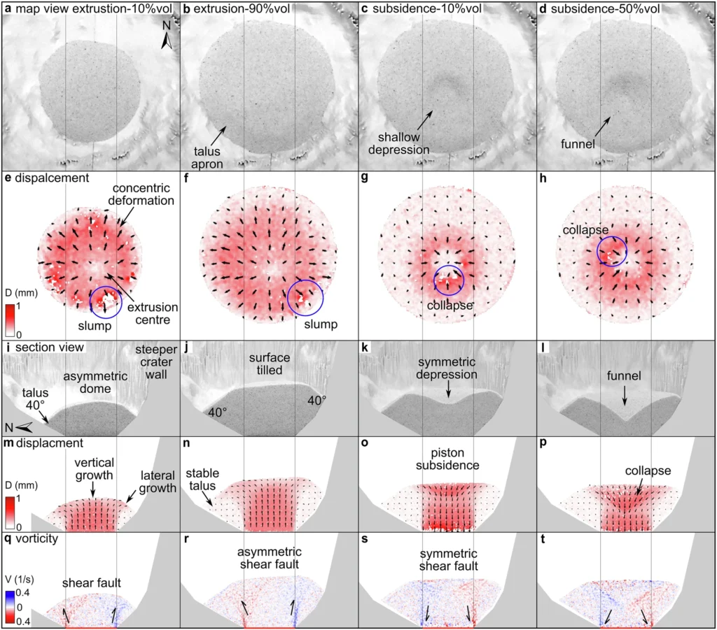 Das Ergebnis bestätigte die Feldbeobachtungen. Beim Herausdrücken des Materials bildete sich ein kleiner Dom, der durch die ungleichmäßig steilen Kraterwände asymmetrisch anwuchs. Beim Rückzug des Materials entstand dann ein zentraler Trichter, fast identisch zu dem, der am echten Lascar beobachtet wird. Die Bewegungen konzentrierten sich entlang ringförmiger Störungen – genau wie die konzentrischen Risse, die auf den Drohnen- und Satellitenbildern der realen Eruption zu sehen sind.
